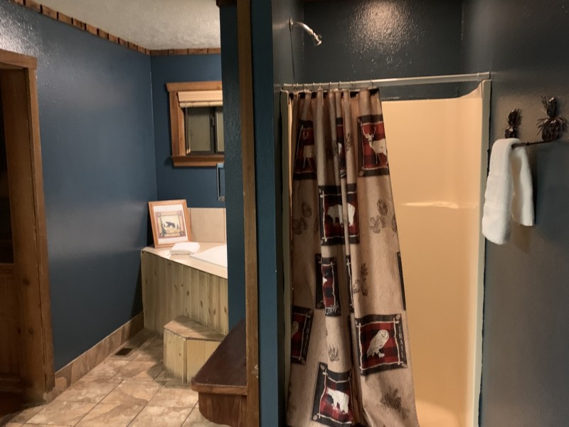 Another of Pine Cone’s fabulous features is the tub for two located in the spacious bath, which also includes a wide vanity with dual sinks, separate shower stall, and enclosed commode. Sink back into the steamy bubbles after a day on the slopes…the large, jetted tub is just the thing for relaxing while you soothe tired muscles. Later, snuggle into the sumptuous king-sized bed and revel in the peace that surrounds Pine Cone. Between the quiet, the comfortable bedding (all bed linens as well as fresh towels are provided for you), and the pure mountain air, you’re sure to sleep deeply and well. But if you do have trouble drifting off, the large cable television over the fireplace is sure to help. You’ll love the luxury of watching TV in bed!