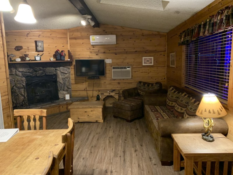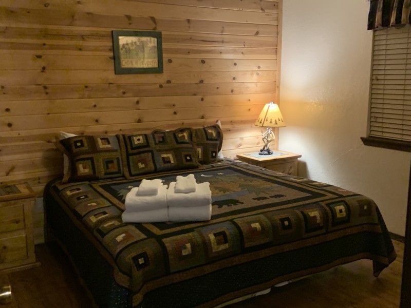 Loaded with rustic charm and comfort, Riverway has everything you need. Situated in an idyllic woodland setting, this quaint cabin sleeps four comfortably with room for two more on the living room sleeper sofa. The cozy living room is a charming, cabin-esque space with a corner-stacked stone fireplace, flat-screen cable TV with DVD player, and southwest-style sofa and chair. Feel like eating in? The large dining table has room for six to enjoy a family meal or board game, and just steps away is the quaint kitchenette. All major appliances are here, as well as a microwave, coffeemaker and toaster, and the cabinets are stocked with all the dishes, cookware, flatware, gadgets and drink ware you might need. Step through the back door and there’s even a gas grill on the handy deck!